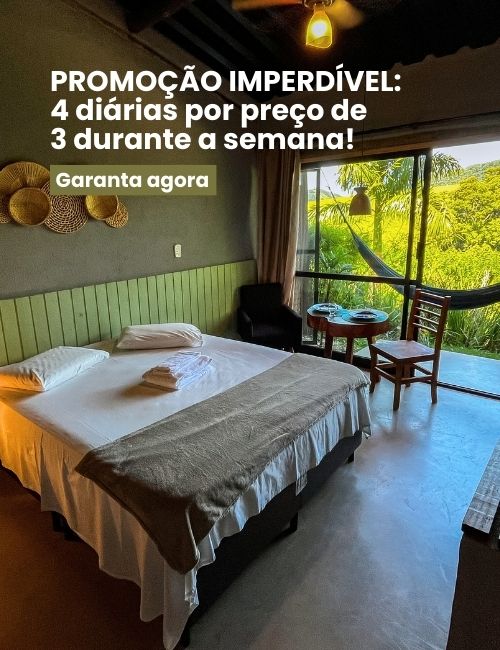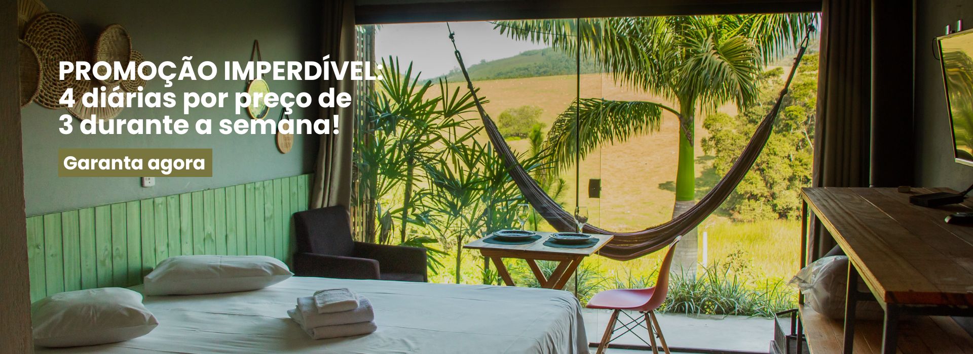 Chalé de 25m² com estilo Boho, oferecendo varanda com rede e vista para as montanhas, em meio à natureza. Possui planta integrada com cozinha completa (frigobar, cooktop e utensílios), suíte com cama queen, e banheiro privativo. Equipado com TV, lareira, ventilador de teto e Wi-Fi. Roupa de cama e toalhas são fornecidas.
